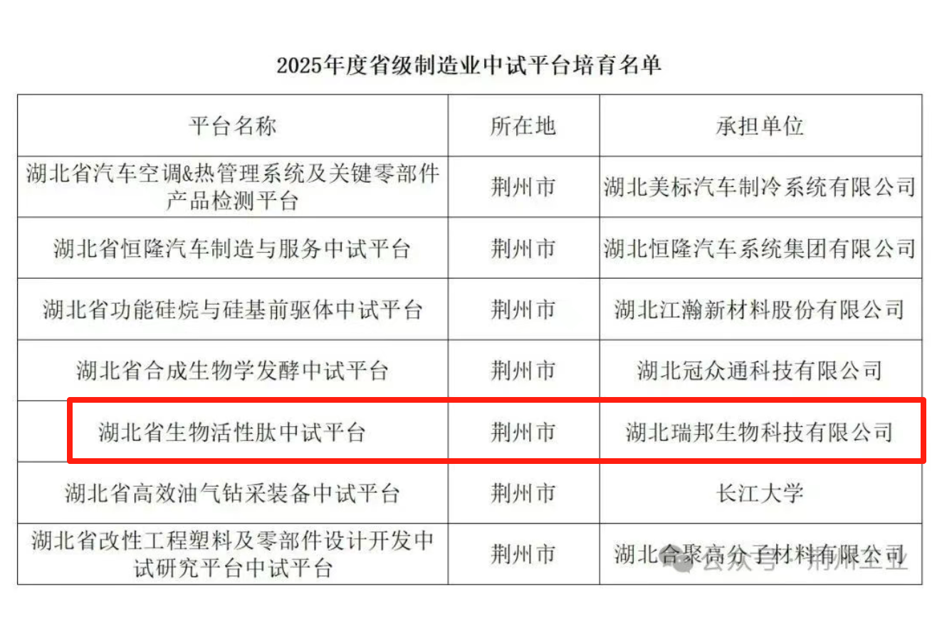 喜訊頻傳!瑞邦生物【生物活性肽中試平臺(tái)】正式入選2025年度湖北省省級(jí)制造業(yè)中試平臺(tái)培育名單!這是對(duì)...